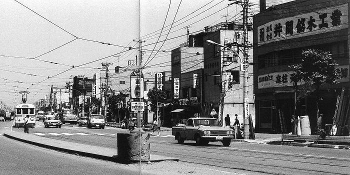 1970年代の東京都江東区富岡町の様子です。右に見えるのがもくもくサンワの前身 井関銘木です。